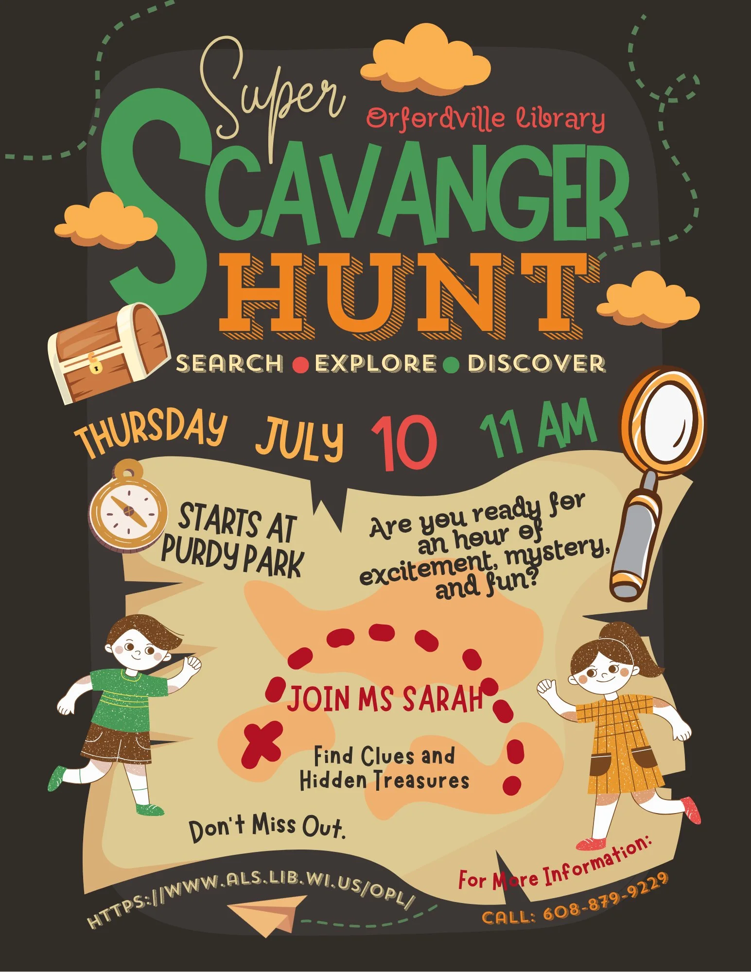 Scavanger Hunt Thursday, July 10, 2025 11:00 AM 12:00 PM 11:00 12:00 Purdy Park 100 West Church Street Orfordville, WI, 53576 United States (map) Google Calendar ICS Scavenger Hunt sponsored by the Orfordville Public Library At Purdy Park at 11 am